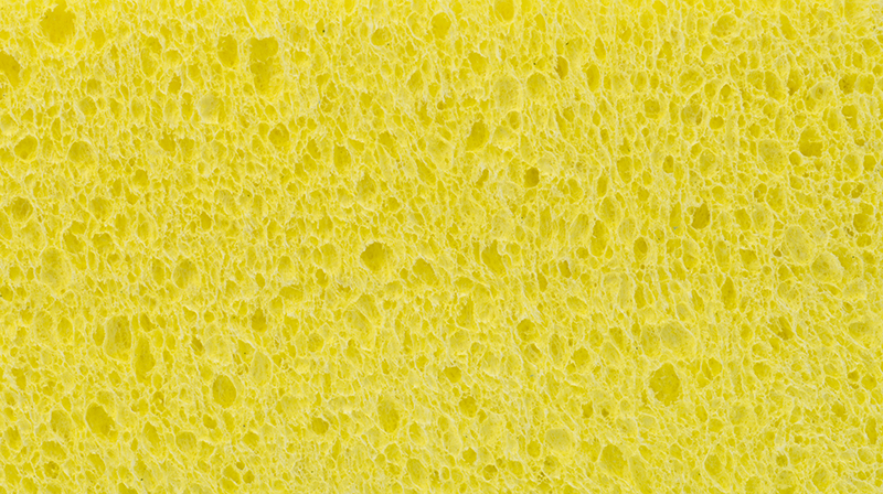¿Qué hace los agujeros porosos en los productos de esponja de celulosa que usamos todos los días? Los cristales de sal que se agregan a la viscosa durante la mezcla se disuelven a medida que el material patentado se coagula en una esponja durante la producción. Esto deja atrás el queso suizo como agujeros que absorben agua y jabón para hacer de las esponjas la mejor herramienta de limpieza con jabón en el fregadero de la cocina.